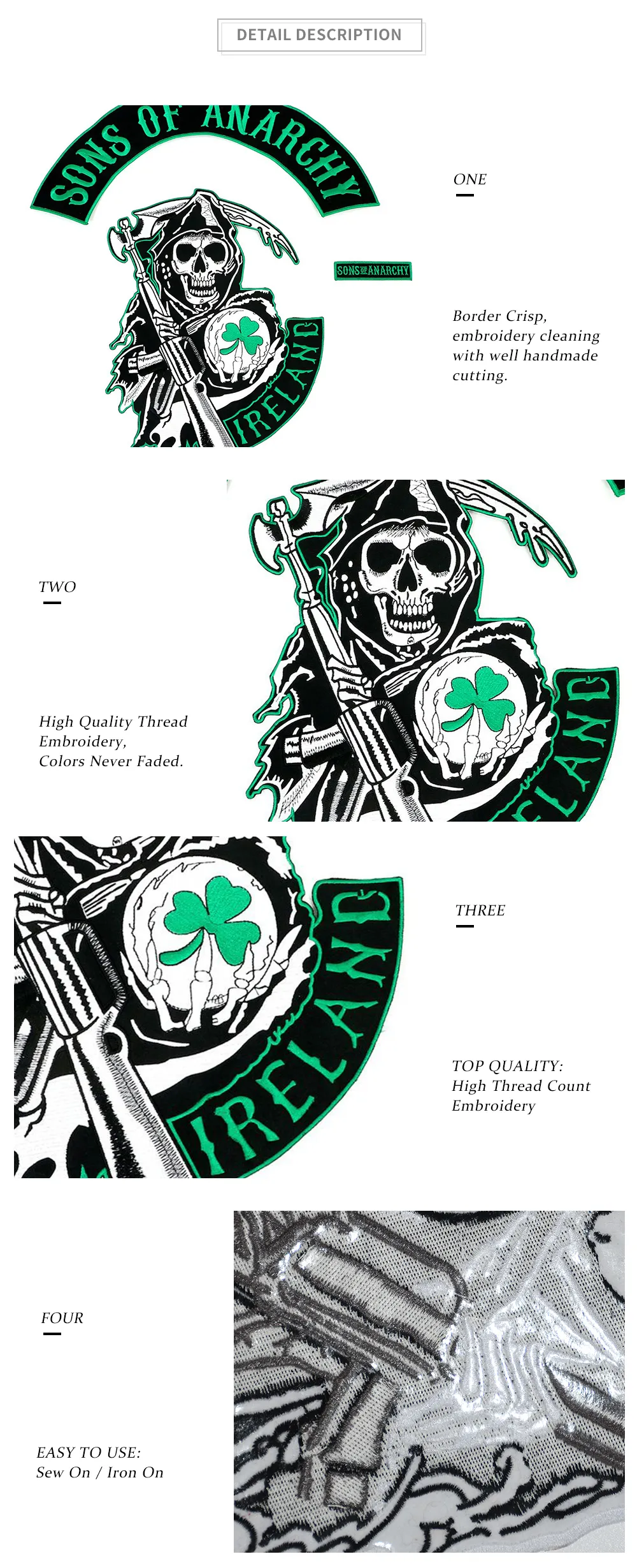 New Arrival Ireland Reaper Motorcycle Biker Patch Iron On Back of Jacket Skull Ball Clover Applique Embroidery Patch Free Shipping